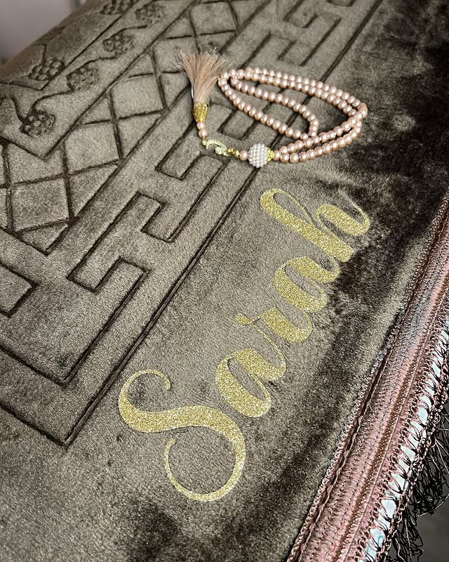 Ensemble “Tapis & Tasbih” personnalisé — un duo élégant et spirituel pour accompagner la prière avec douceur et beauté.